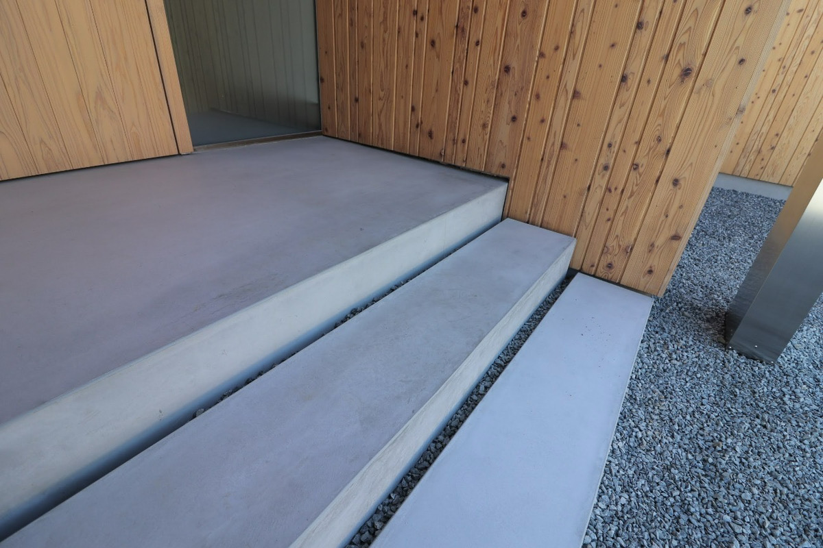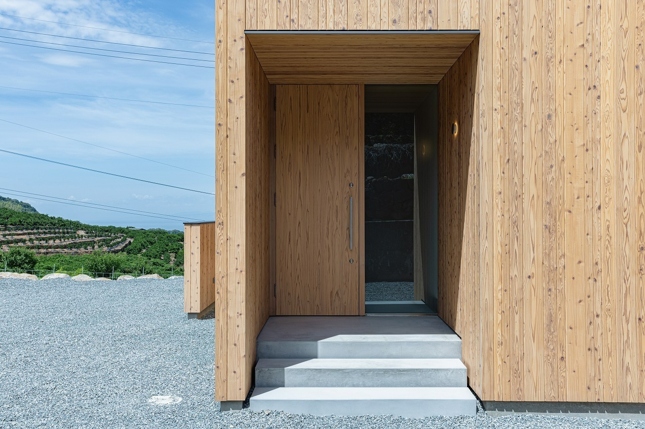 玄関ドアだけが主張するのではなく、外壁の流れをそのまま引き継ぐことで、